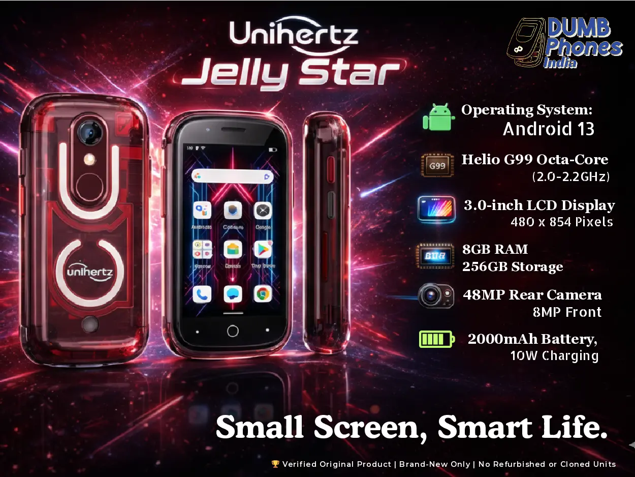 The Unihertz Jelly Star is a mini Android smartphone powered by Android 13 and packed with modern smartphone capabilities in a palm-sized body with a 3-inch display. It runs all your favourite apps — from WhatsApp to Google Maps and UPI — but on a significantly smaller footprint than typical phones.